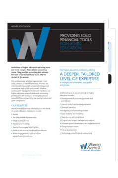 Our team of higher education consulting experts has experience handling complex organizations with multiple components, and we have provided a combination of audit, tax and consulting services to many educational and related institutions. Our expertise includes foundations, alumni associations, real estate entities, GASB audits and Single Audits in accordance with the Uniform Guidance and Government Auditing Standards (Yellow Book). Warren Averett’s higher education consulting team is one of the largest providers of Single Audits in the Southeast.