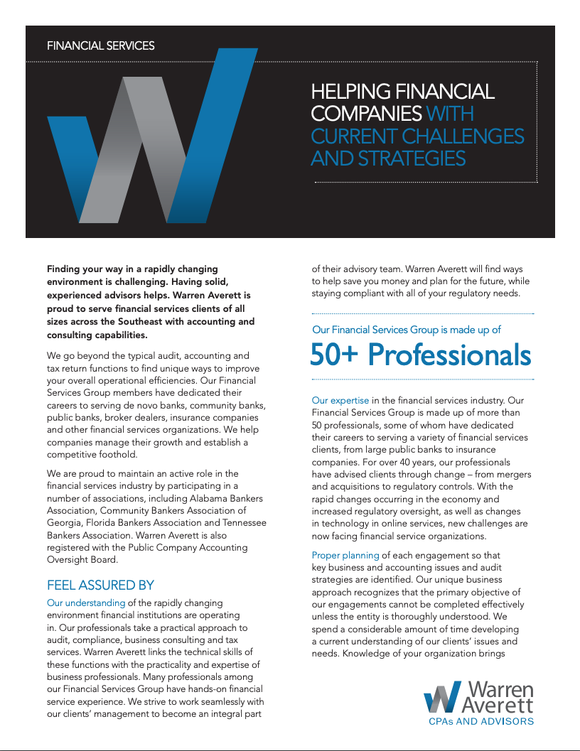 Warren Averett’s Financial Services consulting professionals understand the unique needs of financial institutions, whether we’re providing auditing, regulatory compliance consulting, accounting or tax consultation services or advising on operational efficiencies. Our team is a trusted, experienced resource that not only stays on top of shifting dynamics affecting your business but guides you with agility and accuracy and ensures full compliance.