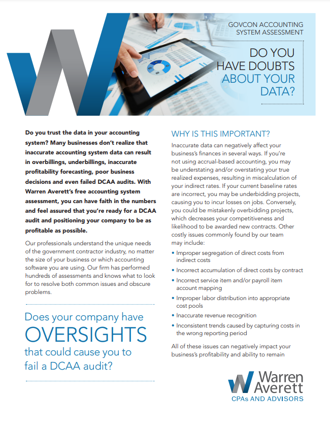 We have a solid track record of helping government contractors assess the adequacy of their accounting systems and can help you determine whether inaccurate data could be negatively impacting your bids or putting your compliance in jeopardy.