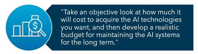 To avoid unwanted surprises and unanticipated expenses, take an objective look at exactly how much it will cost to acquire the AI technologies you want, and then develop a realistic budget for maintaining the AI systems for the long term.