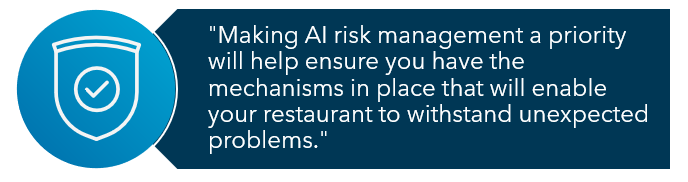 These risks shouldn’t completely deter you from implementing AI, but they should be on your radar. Making AI risk management a priority will help ensure you have the mechanisms in place that will enable your restaurant to withstand unexpected problems. Start by identifying risks for your specific situation and AI use, and then develop corresponding risk management strategies.