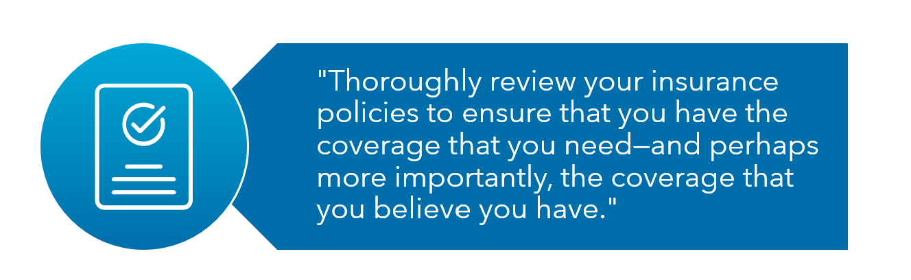 Possibly the most important step that you can take to prepare your business for a natural disaster is to thoroughly review your insurance policies to ensure that you have the coverage that you need—and perhaps more importantly, the coverage that you believe you have.