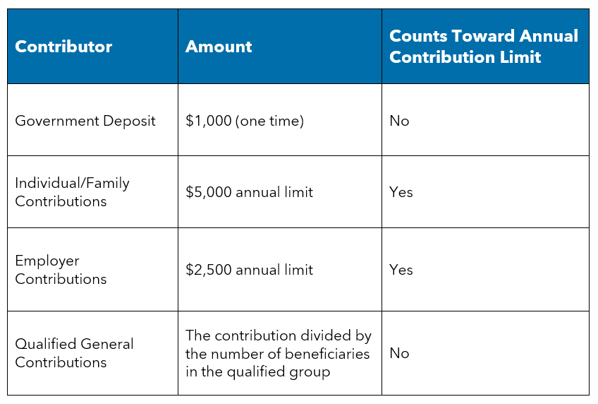 Employers may contribute up to $2,500 annually, which is not taxable at the employee or employer level. The employer’s contribution counts against the $5,000 yearly limit and is taxable upon withdrawal.