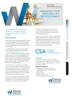 Warren Averett’s Daily Money Management Team offers highly specialized strategic and coordinated services to high-net-worth individuals and families. Our team will develop a comprehensive plan specific to your unique situation that allows you the freedom to do what’s most important to you—without the burden of managing the financial logistics. We commit to learning your personal preferences, lifestyle and goals so that we can support them with our advisory insight.